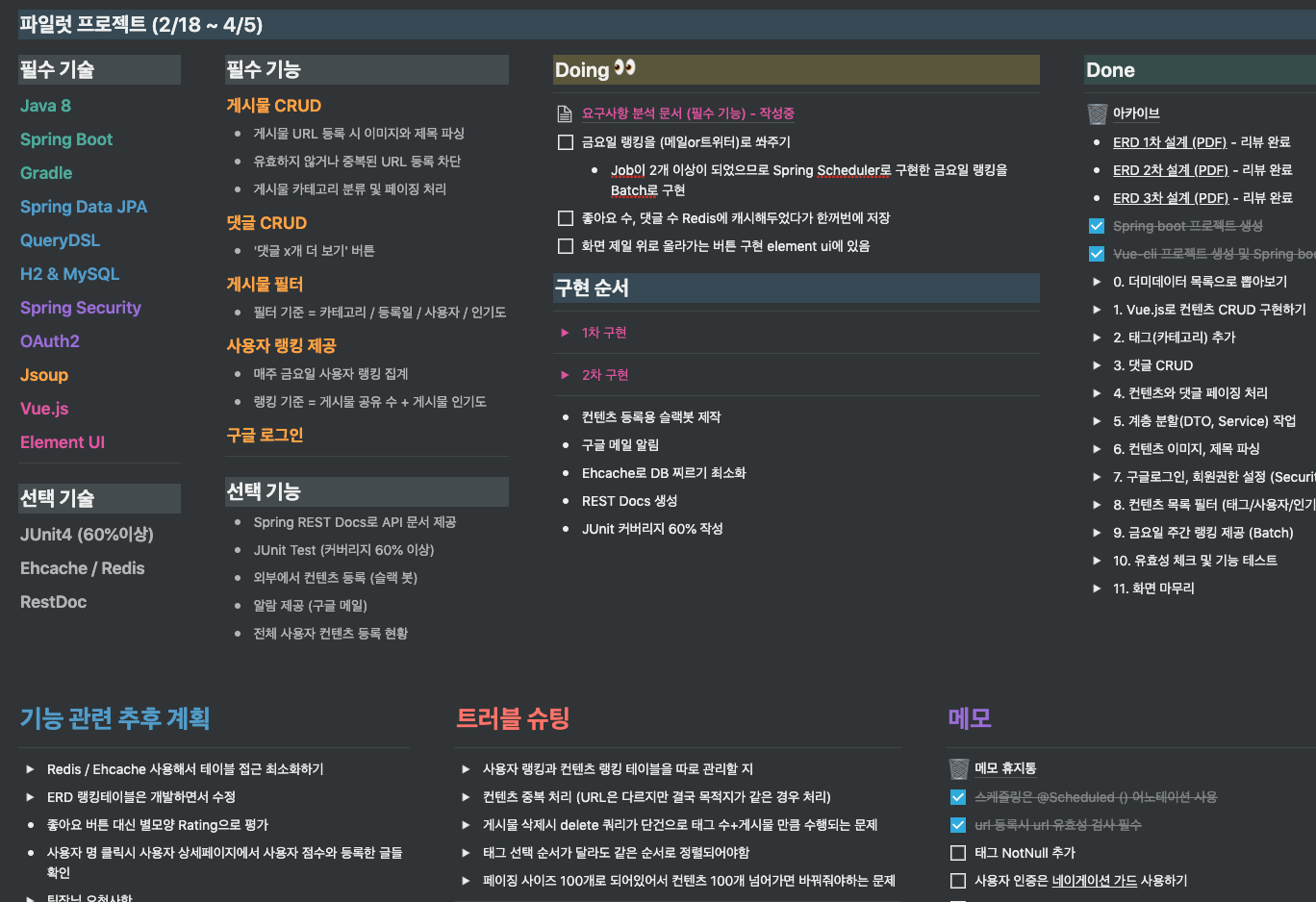 파일럿 프로젝트는 정해진 기간 안에 ERD 설계부터 Vue.js를 활용한 화면단까지 모든 것을 직접 개발해야 했고, 최대한 질문하지 않고 스스로 해결하는 것이 암묵적인 룰이었기 때문에, 스케줄 관리가 중요했다.