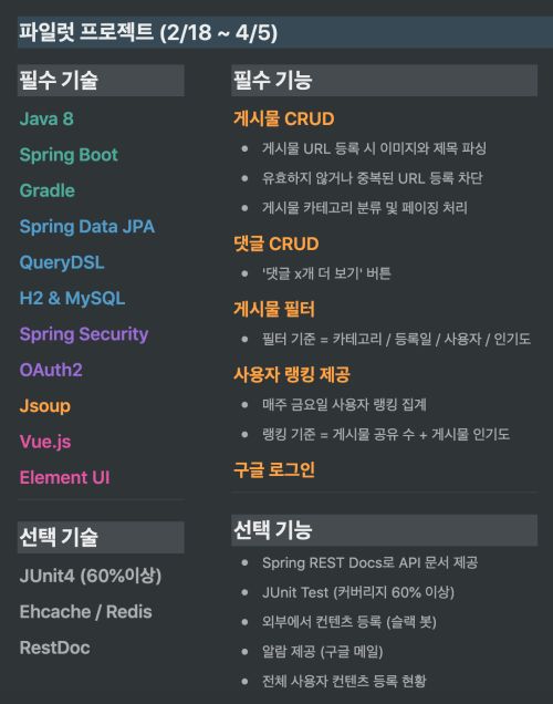 입사 첫날, 내가 속하게 될 파트의 선임 개발자분께서 아래와 같이 프로젝트 주제와 필수/선택 기술과 기능을 정해주셨는데, 주제는 포털개발팀 팀원 간 기술 공유를 활성화하기 위한 개발 컨텐츠 공유 서비스였다.