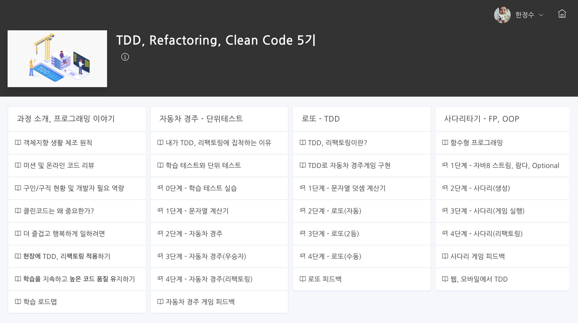 약 5주간 박재성 님의 TDD, Refactoring, Clean Code 5기를 수강했다.
