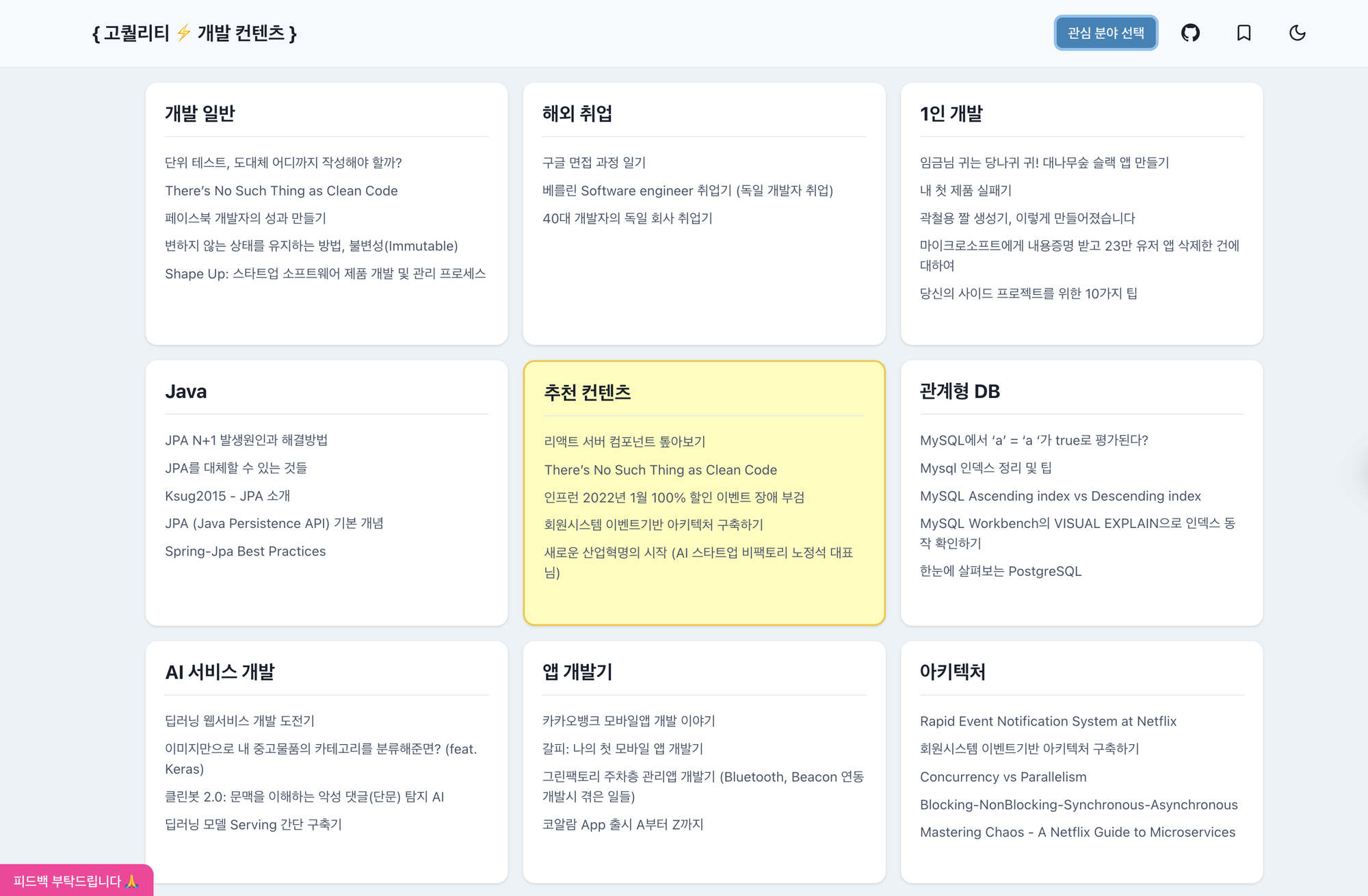 그래서 지난 몇 년간 쌓인 콘텐츠 중 더 이상 가치가 없는 것들을 과감하게 제거하고 카테고리를 다시 분류했다. 이 작업만 몇 주가 소요되었고, 별다른 기능은 없었지만 Next.js와 Supabase로 만들어서 일단 출시부터 했다.
