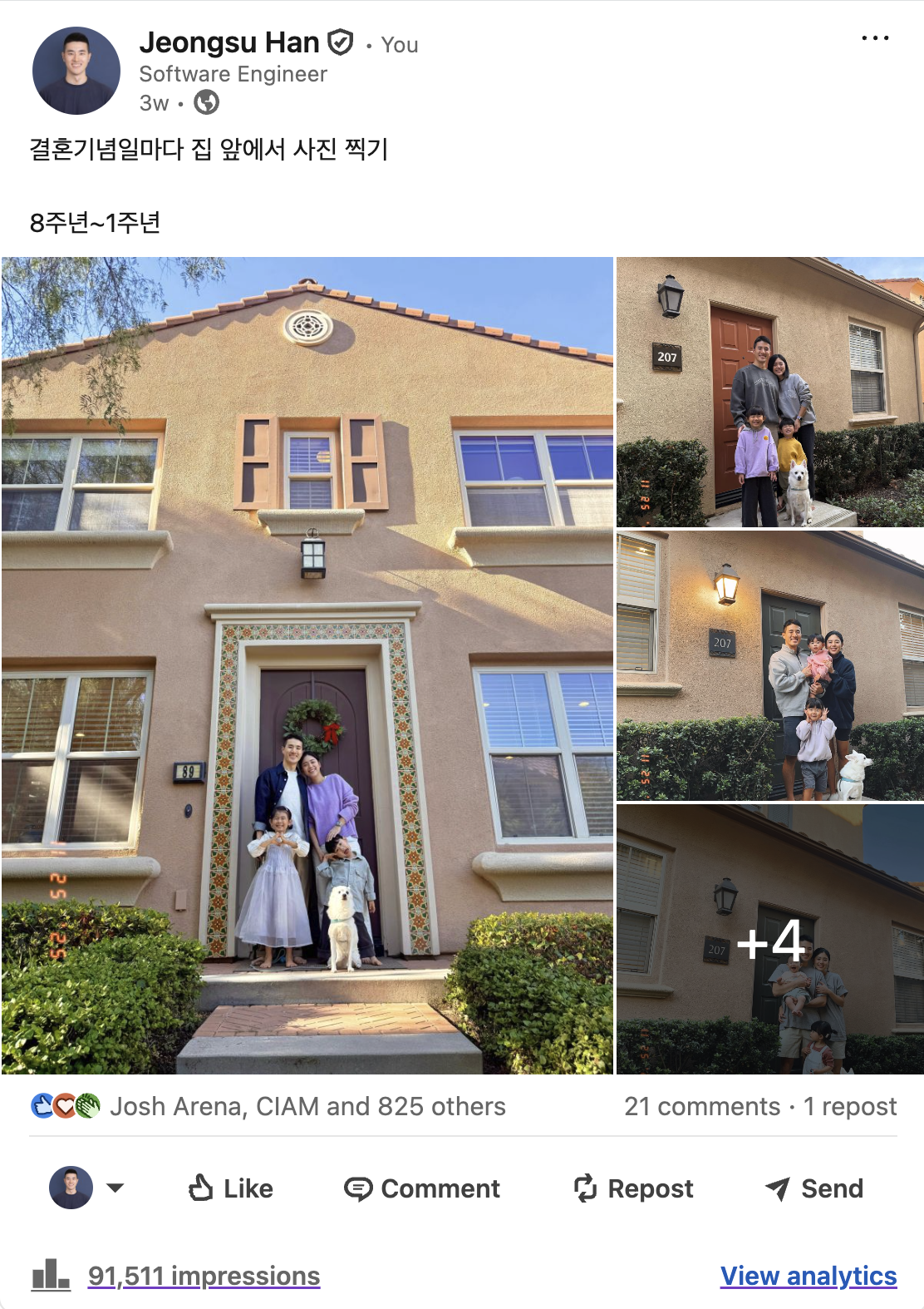 우리는 전셋집에 들어갈 돈이 없어서 처갓집 방 한 칸에서 시작했고, 그 이후 돈을 모아서 2020년에 17평 방 한 칸짜리 전세 아파트로 분가해서 아이 둘을 키우다가 2022년에 미국으로 왔다.