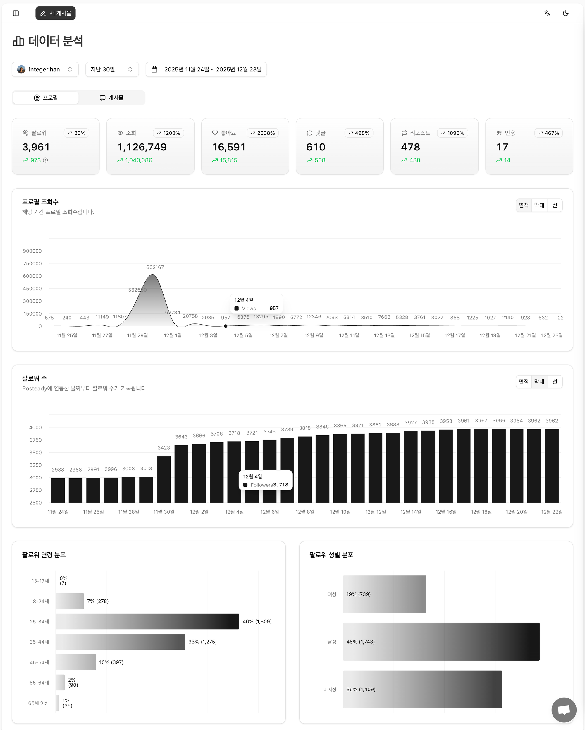 내가 현재 가장 많이 사용하는 소셜미디어인 Threads(스레드)부터 연동하기 시작했고, 앞서 소개한 세 가지 문제 중 1번과 2번 문제(편리한 예약/게시/분석)를 해결하는 기능부터 구현했다.
