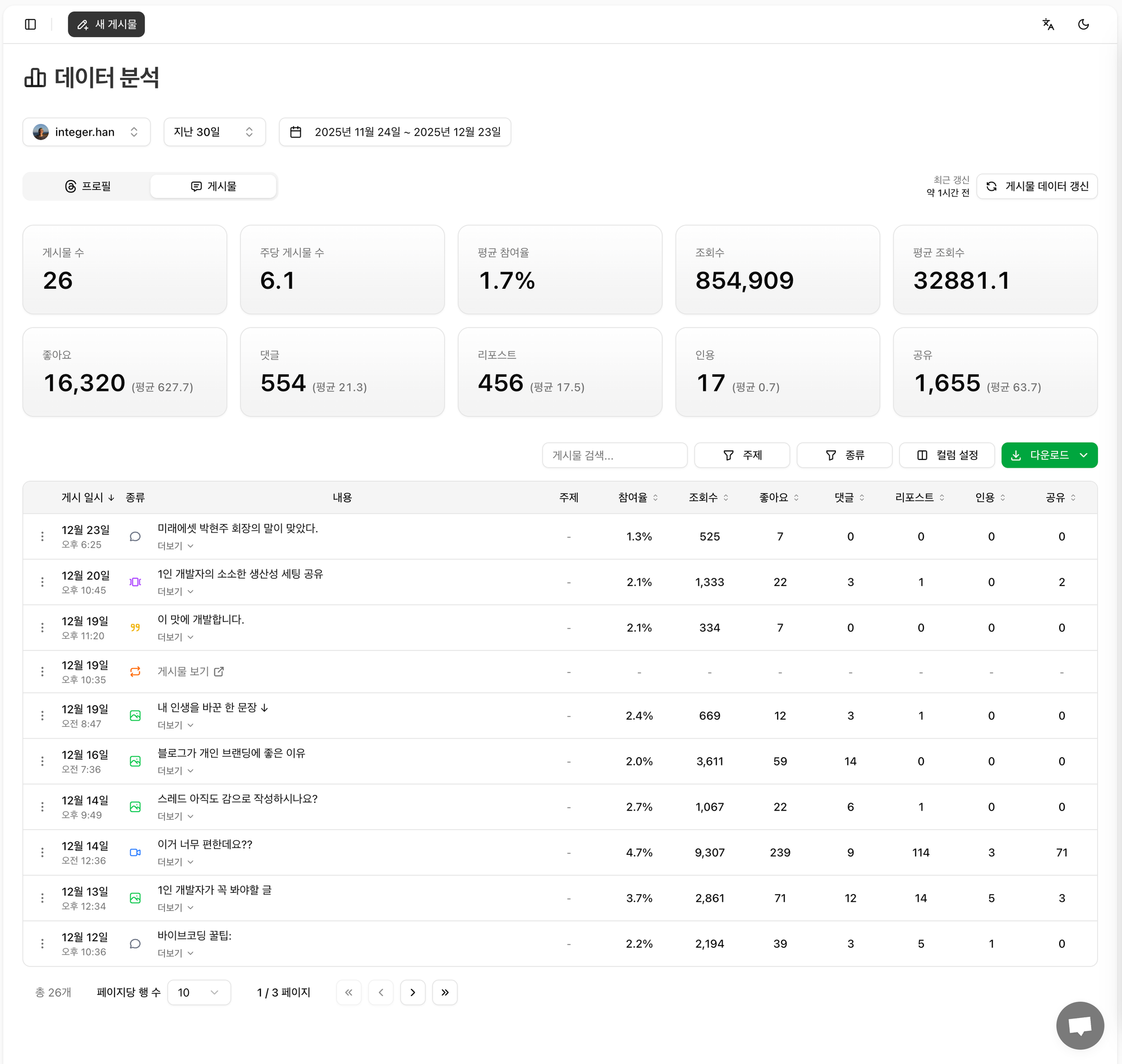 - 게시한 콘텐츠들의 성과 분석이 번거롭고