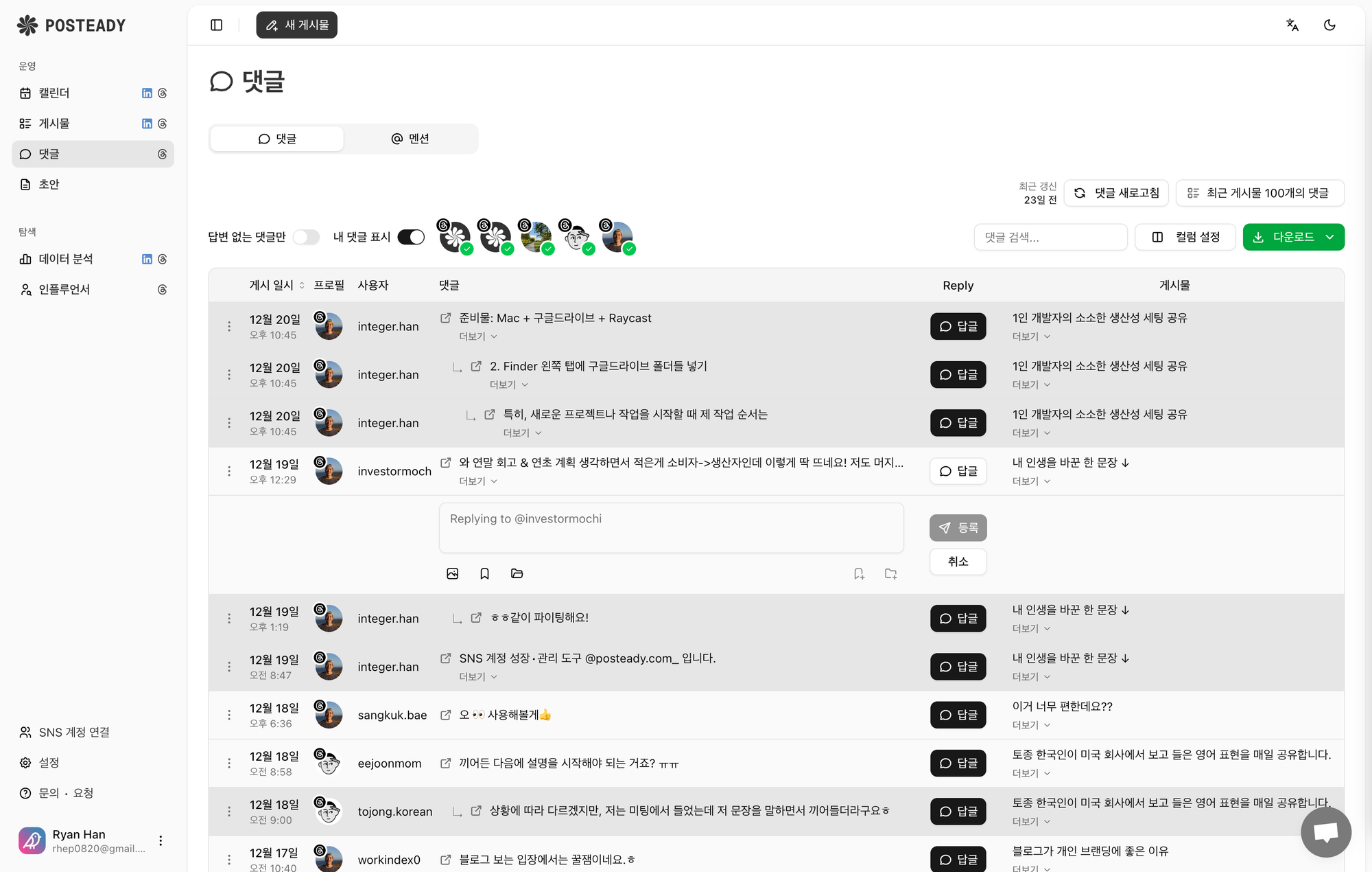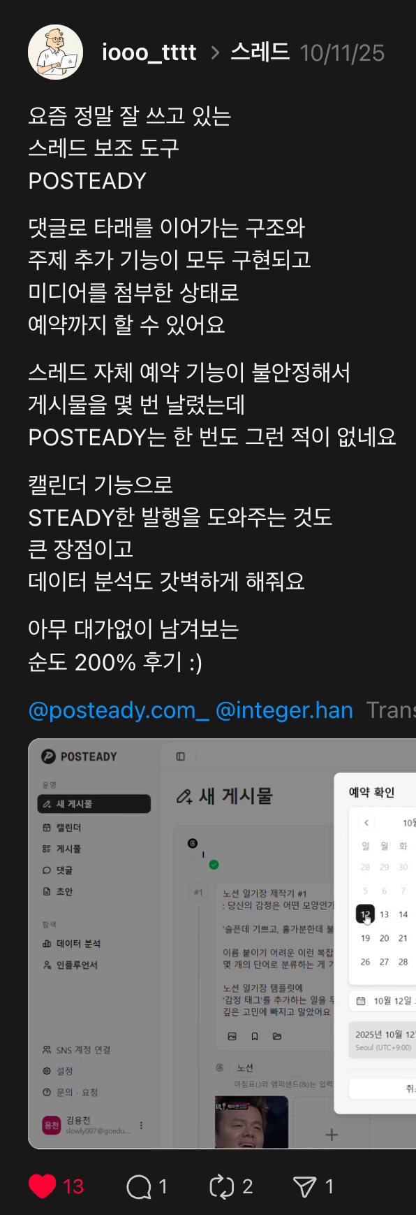 곧 Posteady에 X(트위터) 연동 기능을 출시하면, 2026년 1월부터는 본격적으로 X, 스레드, 링크드인을 통해 1인 개발 과정, 결과, 꿀팁, 노하우들을 공유할 예정이다.