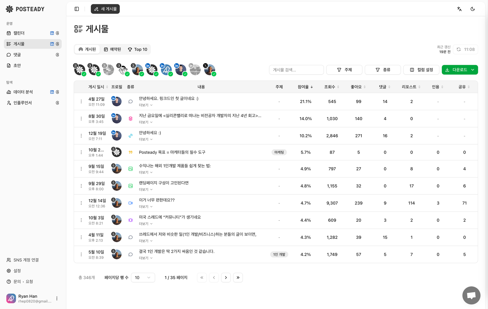 연동한 계정들의 모든 게시물을 한 테이블에서 보면서 쉽게 정렬/필터 할 수 있다.