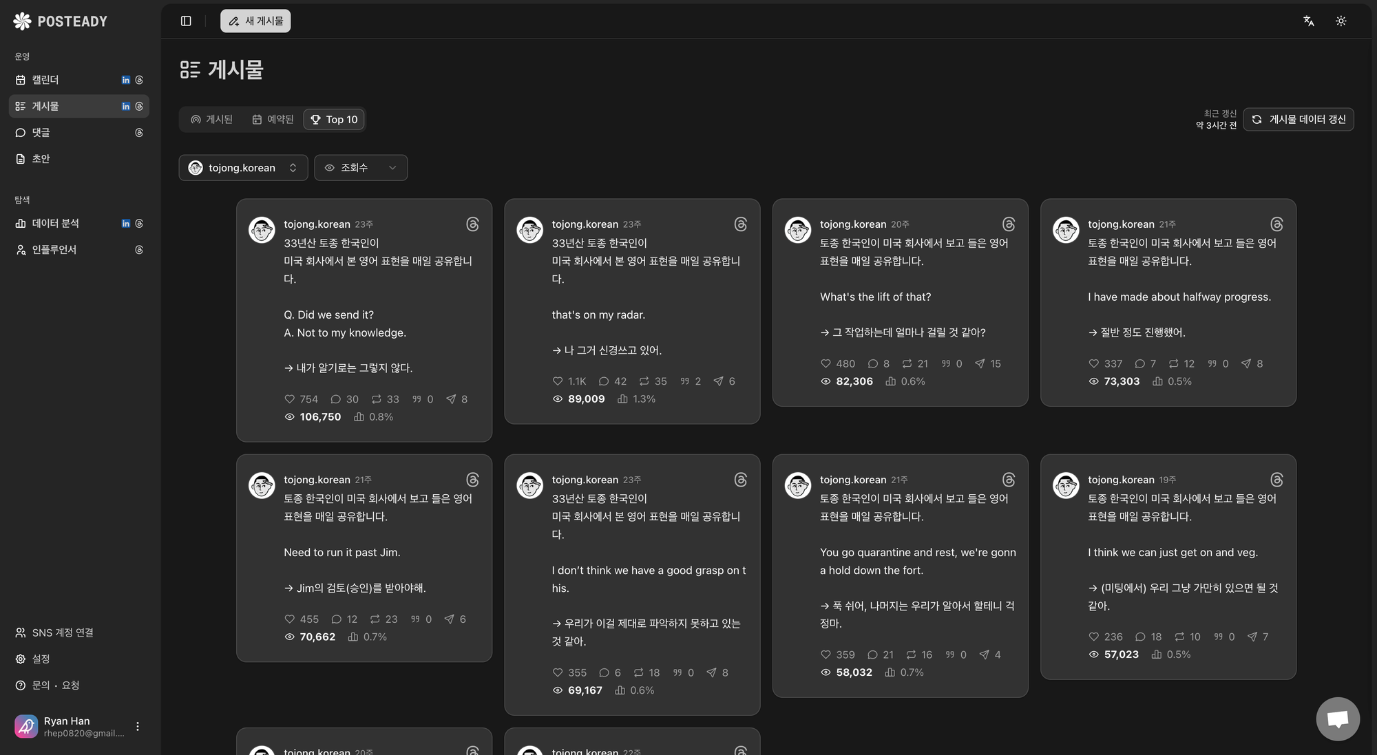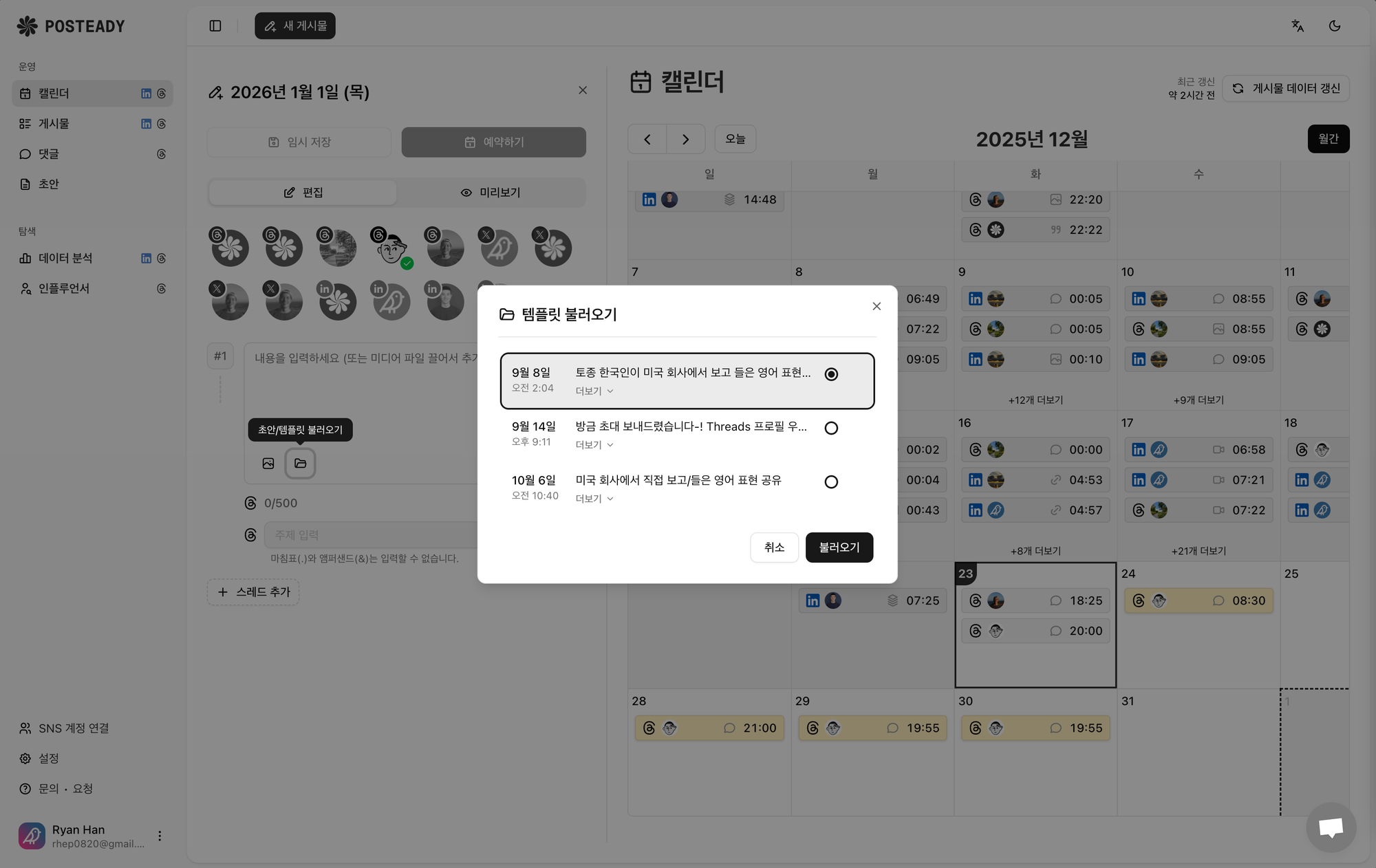이 계정은 시간을 거의 투자하지 않고, 노션에 메모해둔 문장들을 Posteady에서 게시물로 예약해 두는 방식으로 손쉽게 운영하고 있다. 심지어 예약할 때도 미리 저장해둔 템플릿을 불러와서 영어 표현만 갈아 끼우는 방식으로 딸깍 딸깍 예약만 해둔다.