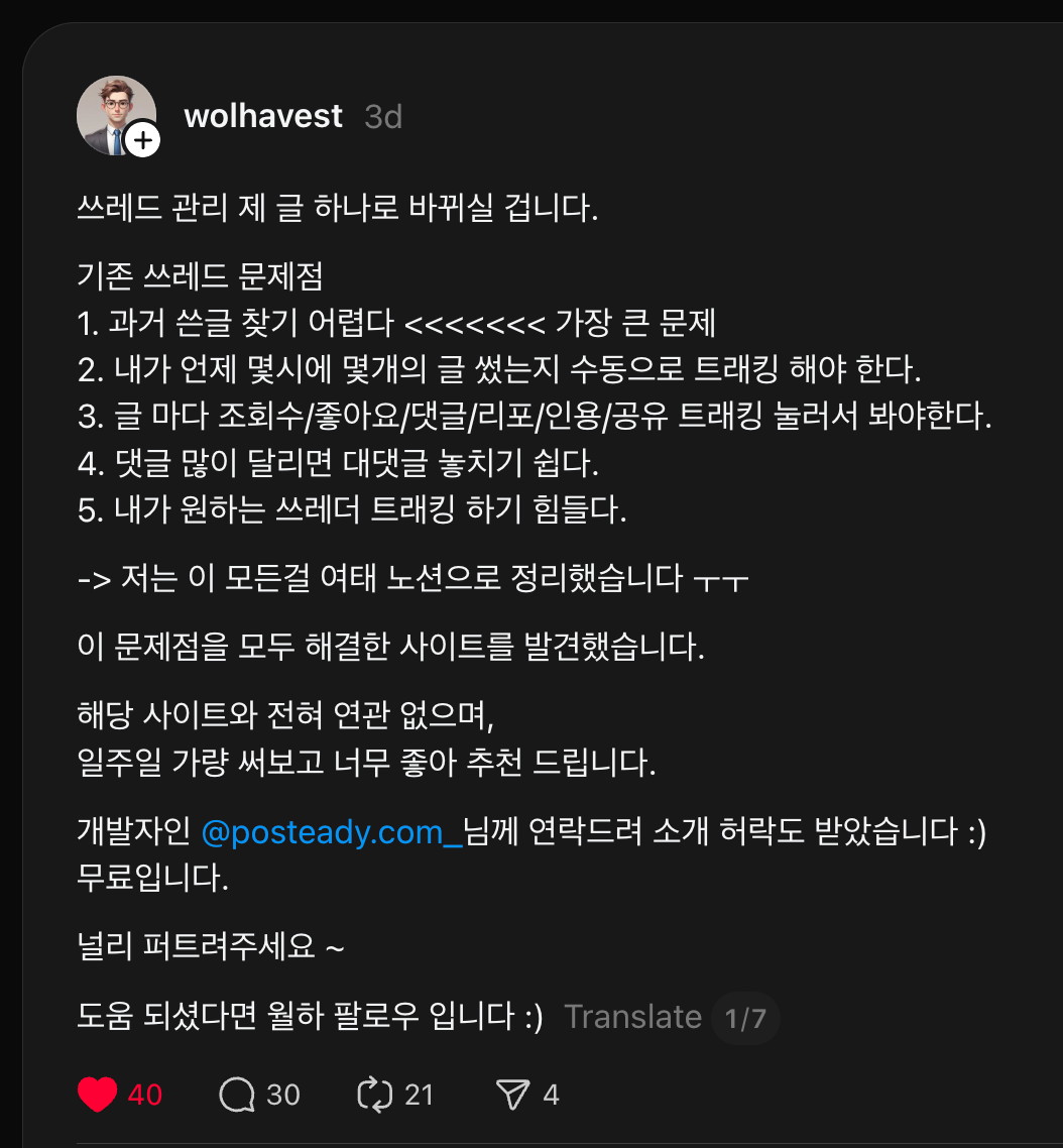 그래서 스레드를 본격적으로 시작했다. (스친님들~ 이런 멘트는 안 쓴다) 처음에는 사이드허슬러스토리 계정 운영을 위해 시작했다가, 뉴스레터를 중단한 후에는 X에서 활동하는 해외 1인 개발자들처럼 내 계정을 운영하기 시작했다.