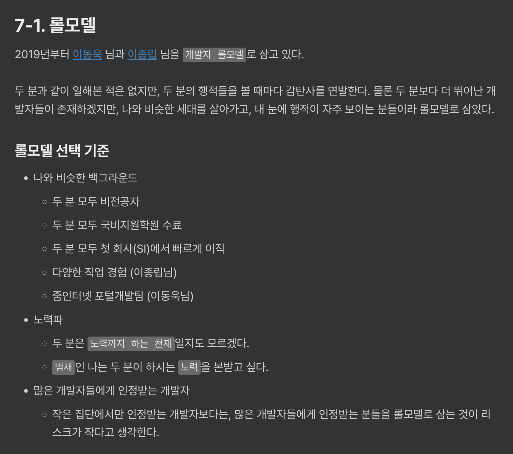 개발자 커리어를 막 시작해서 성장에 열을 올리던 2019년에는 이동욱 님과 이종립 님을 롤모델로 정했었다. 두 분 모두 비전공자 개발자셨는데, 정말 빠르게 성장하시고 업계에서 인정받는 분들이었기 때문이다.