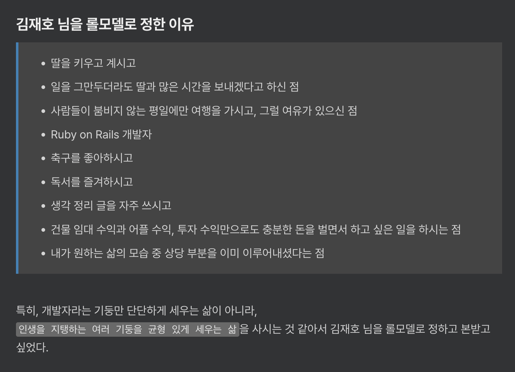 회사에 속하지 않은 개발자로서, 인생을 지탱하는 여러 기둥을 균형있게 세우는 삶을 모습을 본받고 싶었기 때문이다. 회사에 종속된 개발자라는 포지션에 약간의 환멸을 느끼기 시작한 때였다.