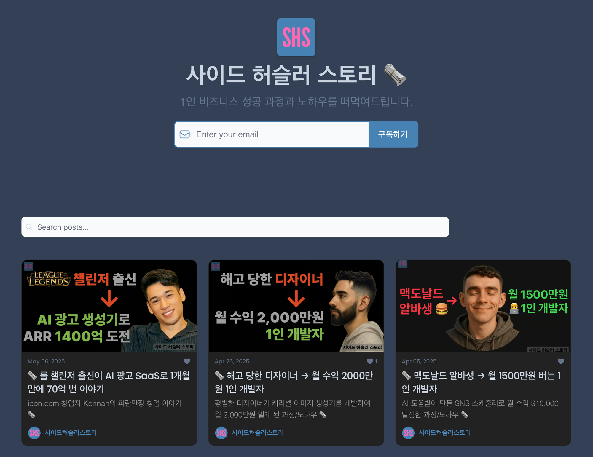 2023년 8월에 시작해서 2개월 만에 구독자 2천명을 모았던, 1인 개발자들의 이야기를 다룬 사이드 허슬러 스토리 뉴스레터를 2025년 4월에 다시 시작했다.