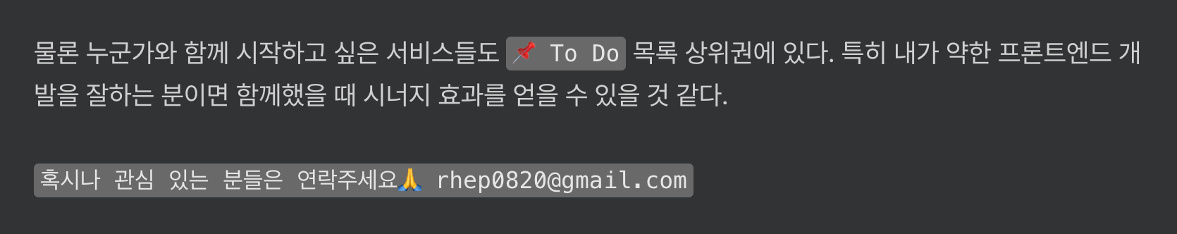 감사하게도 몇 분께서 이메일을 보내주셨지만(감사합니다 🙇♂️) 여러 사이드 프로젝트를 병행하는 상황이었기 때문에 이미 합을 맞춰 본 분과 하는 게 낫겠다는 판단이 들었다. 그래서 내가 함께 일해 본 프론트엔드 개발자 중 가장 먼저 떠오른 황준일님에게 연락을 드렸다.
