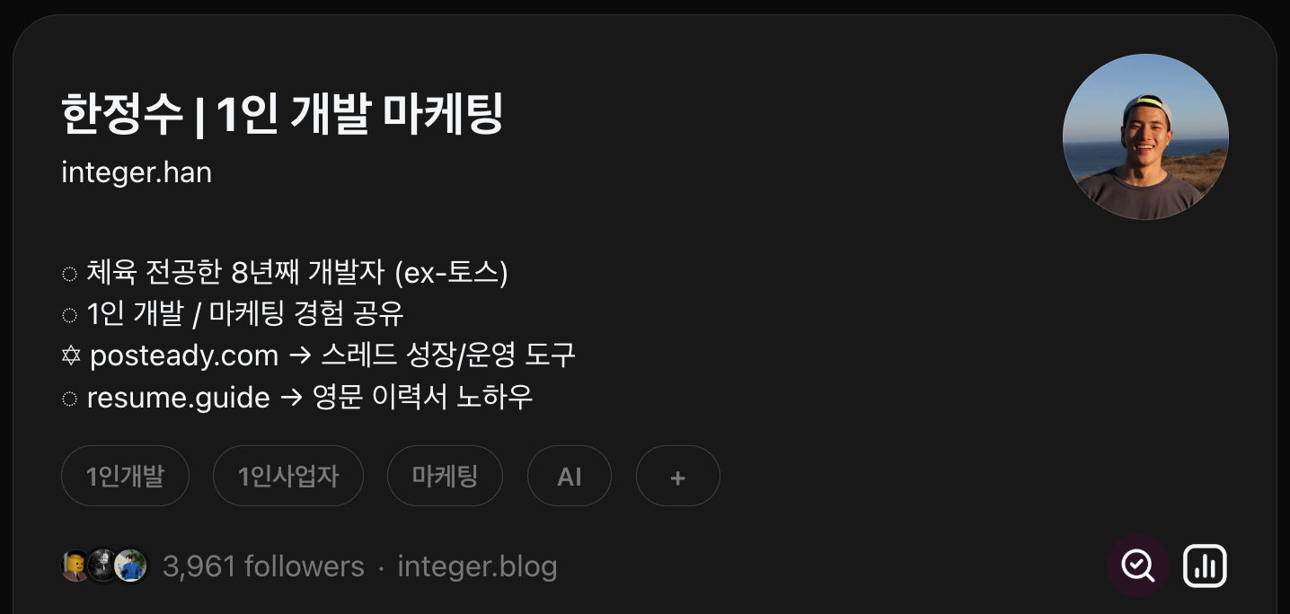 1인 개발 과정과 내 생각, 1인 개발하면서 알게 된 꿀팁과 정보들을 그냥 툭툭 던지고 있는데, 생각보다 많은 분들이 좋아해주셔서 그냥 얼굴과 이름을 다 오픈하고 계정을 운영하고 있다. 익명 프로필이 많아질수록, 진짜 프로필의 가치가 더 커진다는 생각으로