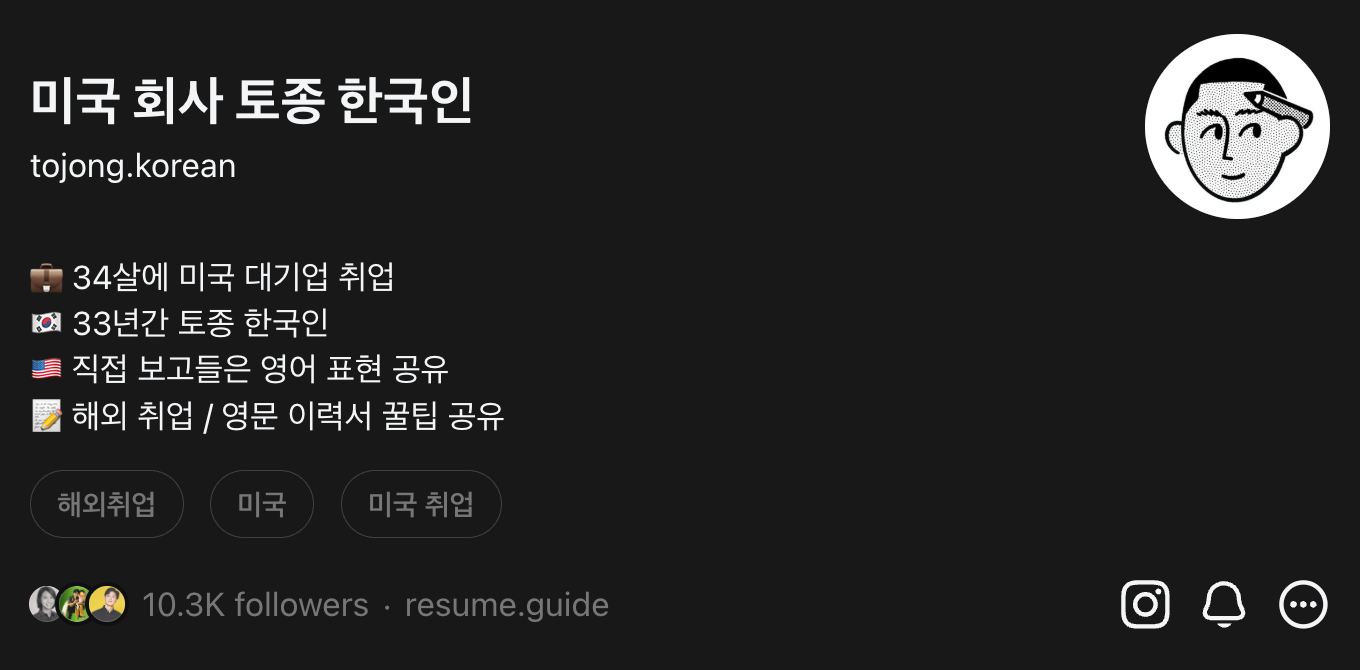 내가 회사에서 직접 보고 들은 영어 표현을 공유하고, resume.guide의 마케팅을 위해 만든 스레드 @tojong.korean 계정은 한 달 만에 팔로워 1만 명을 모셨다.