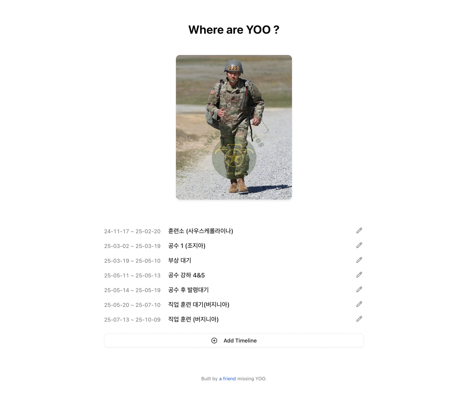 그러다 친구가 미군의 복잡한 훈련 일정을 매번 지인들에게 반복해서 알려주는 모습을 보고, 성이 Yoo고, 군복 이름표에 YOO가 붙은 친구가 언제 어디에서 훈련받는지 직접 관리하고, 지인들에게 쉽게 공유할 수 있도록 WhereAreYoo.com 을 만들어줬다.